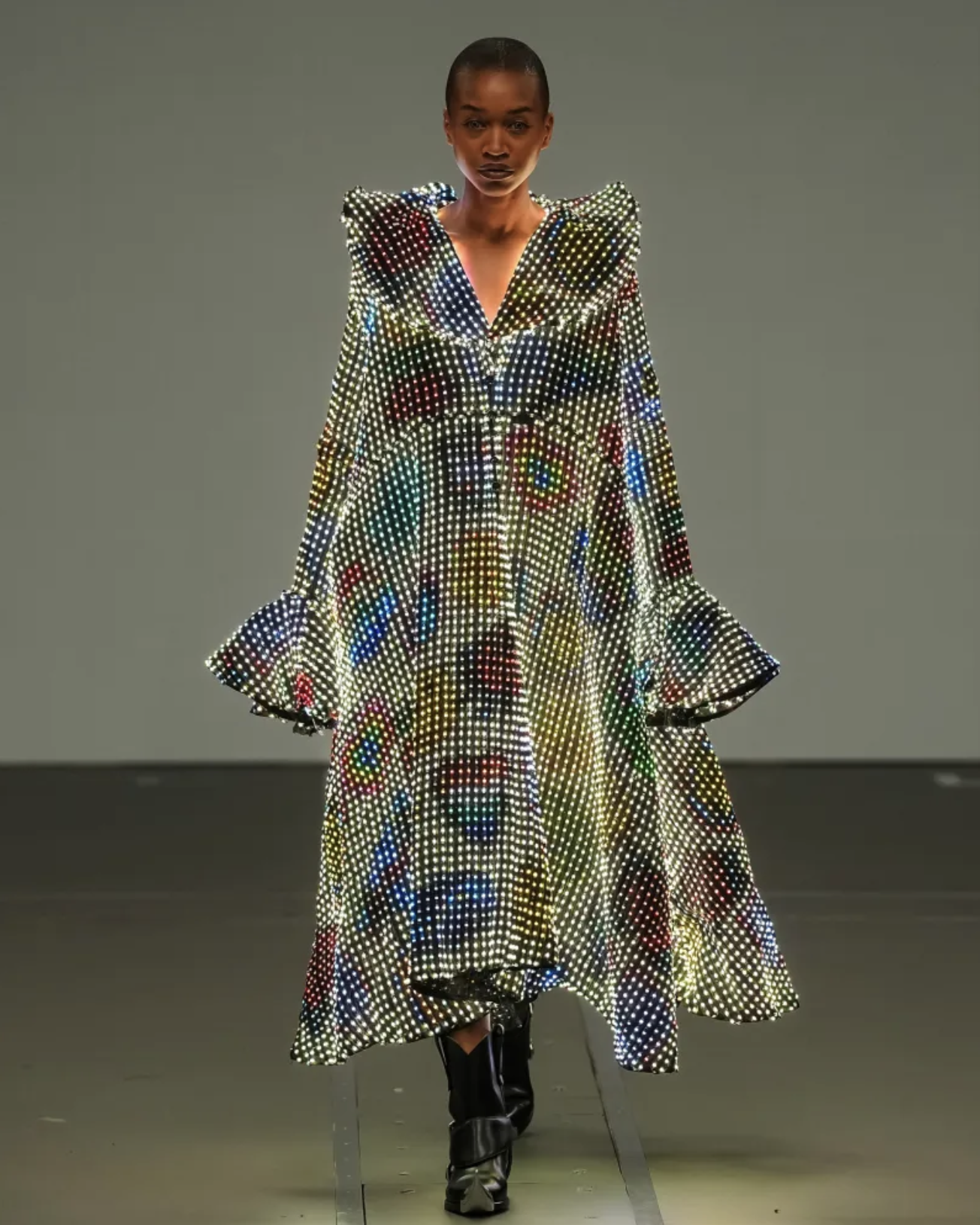 The FW26 collection centered on garments that functioned more like modular display surfaces than traditional textiles. Coats, dresses, and structured outerwear incorporated LED panels capable of presenting animated imagery. During the show, large-scale projections formed the visual backdrop of the runway while the garments displayed fragments of the same visuals through embedded displays.