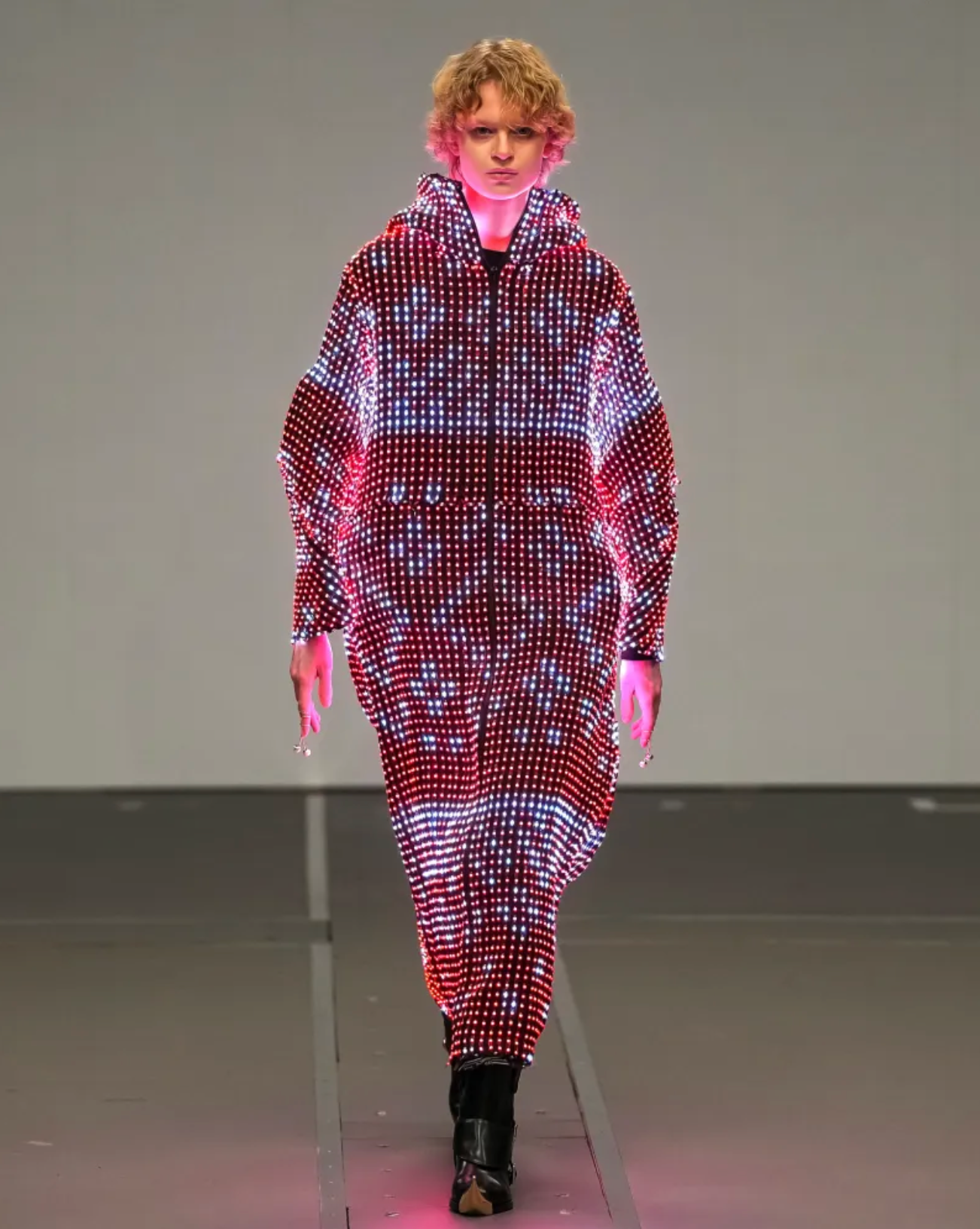 Runway presentations provide a controlled setting where designers can experiment with new materials, visual systems, and interactions between clothing and digital media. In the FW26 show, thermoptic camouflage was explored through garments equipped with LED displays synchronized with the projections surrounding the runway.