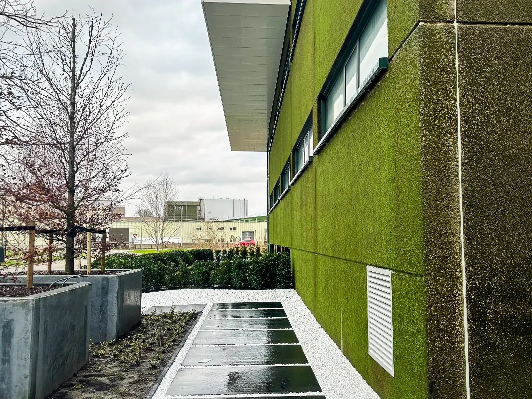 Respyre’s concrete formulation has been applied at Marineterrein Amsterdam Living Lab, an experimental space dedicated to sustainable urban innovations. By coating the exterior walls of selected buildings with Respyre’s bioreceptive concrete, the project aims to turn bare surfaces into thriving, green facades. With its unique ability to thrive in minimal soil and tolerate various weather conditions, moss has taken root on the treated surfaces, creating a low-maintenance, year-round green covering.