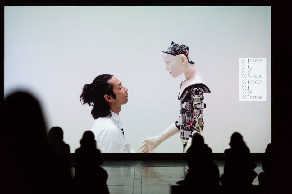 In Co(AI)xistence (2017), developed with researchers associated with the Okinawa Institute of Science and Technology, Emard presents an interaction between a human dancer and a robotic arm equipped with AI-based vision systems. The system observes the dancer’s gestures through cameras and computational sensing technologies, generating responsive movements that unfold throughout the performance.