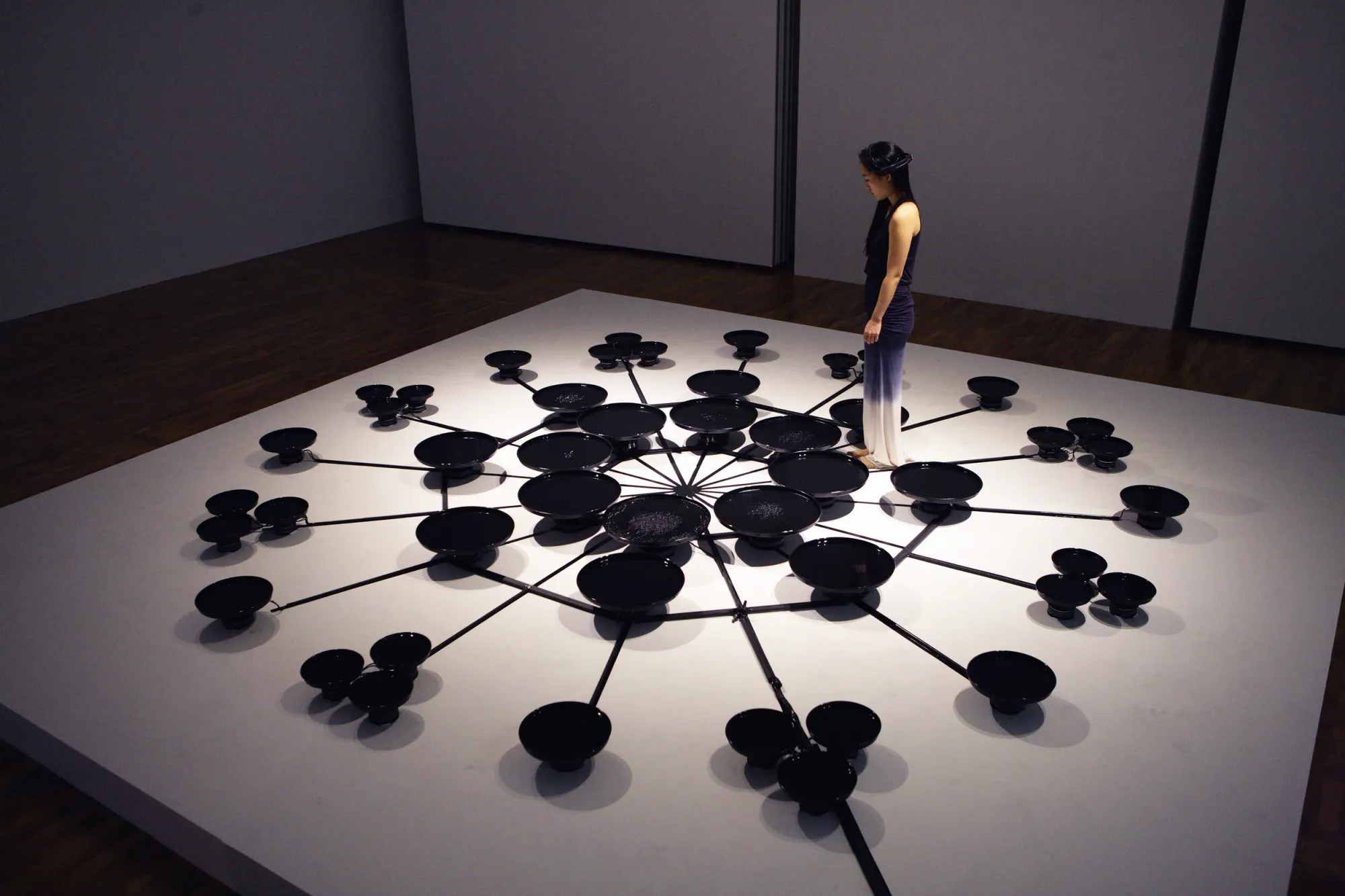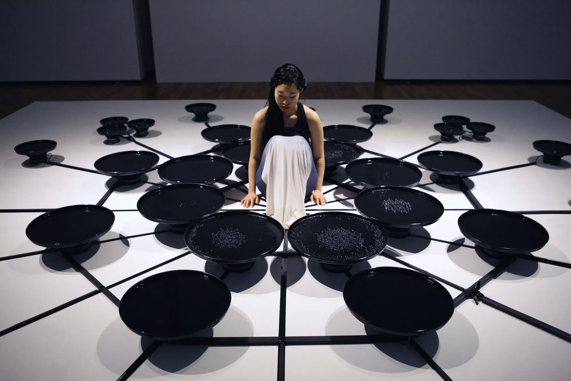 In the performance installation Eunoia (2013), Park wears an EEG device while seated among a circular array of water-filled vessels. Each vessel is connected to a vibration transducer that responds to changes in the EEG signal. As the performer attempts to regulate her mental focus, the vibrations create visible ripples across the water’s surface. The system does not attempt to interpret specific thoughts. Instead, it converts fluctuations in neural activity into subtle physical transformations. The resulting patterns make cognitive dynamics visible, translating otherwise imperceptible neural activity into an observable environmental effect.