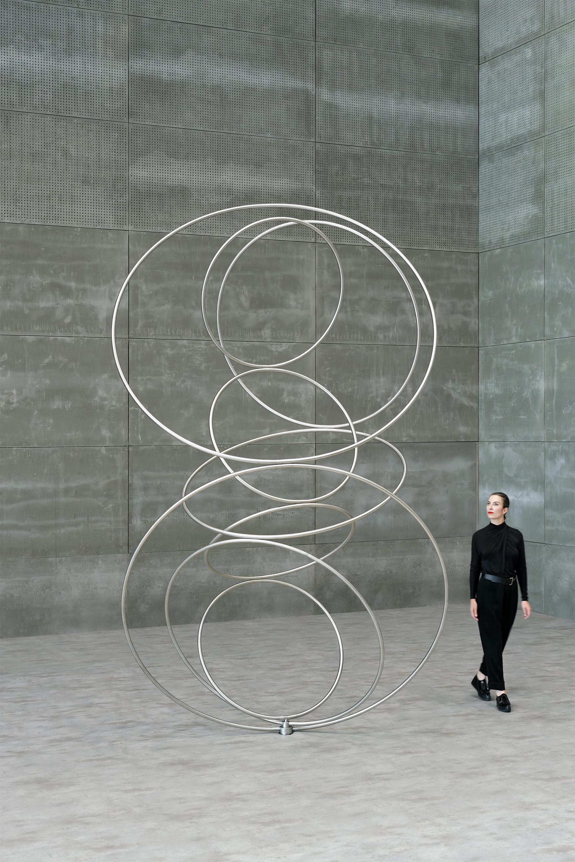 The work situates movement as a primary material. Rather than using motion as embellishment, CYCLES depends on rotation to generate its visual logic. Perception becomes time-based: depth, symmetry, and figure-ground relationships fluctuate according to the rings’ relative positions.