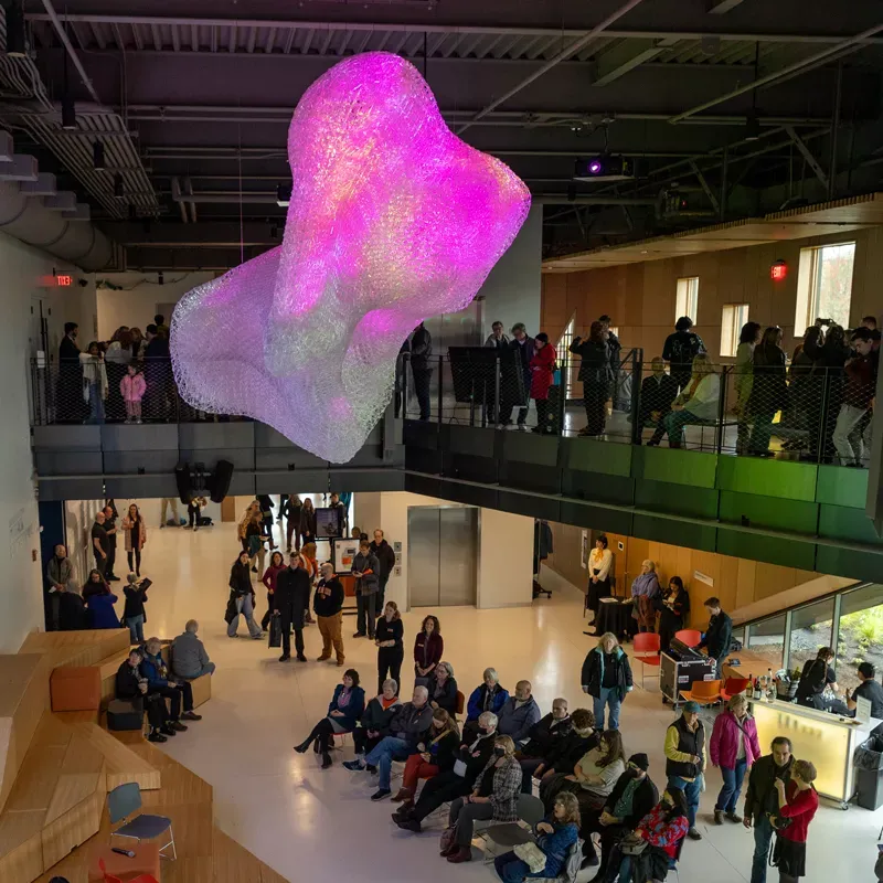 At Oregon State University’s PRAx building, Data Crystal: OSU (2024) by Refik Anadol transforms 10,000 hours of forest audio collected by an array of 1,200 microphones into a crystalline, AI-generated sculpture. Rather than printing datasets, the project uses algorithmic translation to turn ecological monitoring into a physical presence in the lobby, collapsing sound into sculptural form.