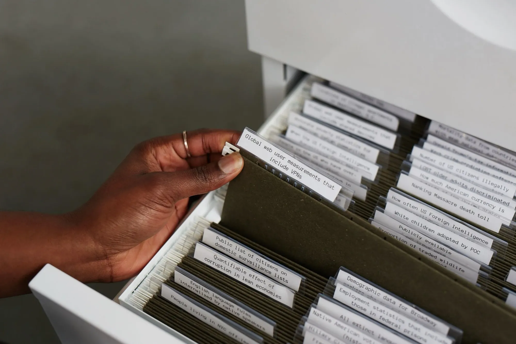Artist and researcher Mimi Ọnụọha shows that what’s absent from datasets can be as revealing as what’s included. Her project The Library of Missing Datasets (2016–ongoing) collects examples of information that institutions routinely fail to gather—such as statistics on undocumented communities, instances of police violence, or other marginalized experiences. By naming these absences, Ọnụọha makes visible that missing data is rarely accidental; it reflects structural conditions and decisions about whose lives are counted and whose are left out.