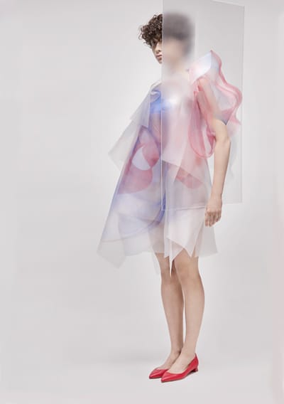 Ying Gao: Swiss fashion designer Ying Gao is renowned for her experimental designs that incorporate interactive elements and cutting-edge materials. Gao's creations often respond to stimuli such as sound, light, or movement, creating a dialogue between the garment and its surroundings. Her approach to interactive fashion is characterized by its poetic sensibility and emphasis on sensory experiences, inviting viewers to explore the relationship between the body and technology. "In Camera" is comprised of two garments fitted with camera lens detectors, which activate when photographed by individuals. Drawing inspiration from the portraits of British figurative artist Francis Bacon, who painted from photographs, these garments evoke hybrid and transient entities. Their ambiguity lies at the core of the project, encapsulated by the name itself: simultaneously private, alluding to moments behind closed doors (the literal translation of 'In camera'), and public, as they rely on the viewer/photographer's gaze.