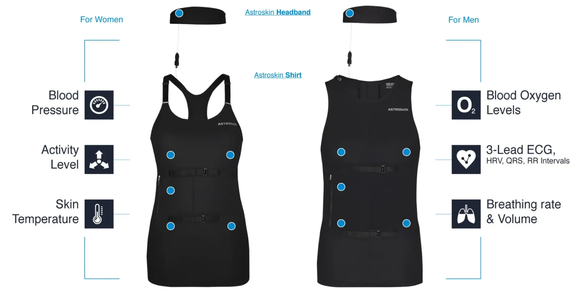 Astroskin offers real-time biometric monitoring for 48 hours, tracking all five vital signs. It provides accurate readings akin to an ambulatory heart monitor, integrating breath sensors, a pulse oximeter, and skin temperature sensors into a single washable garment and headband, eliminating the need for a finger pulse oximeter. It continuously monitors 3-lead ECG, blood oxygen levels, respiration, and skin temperature.