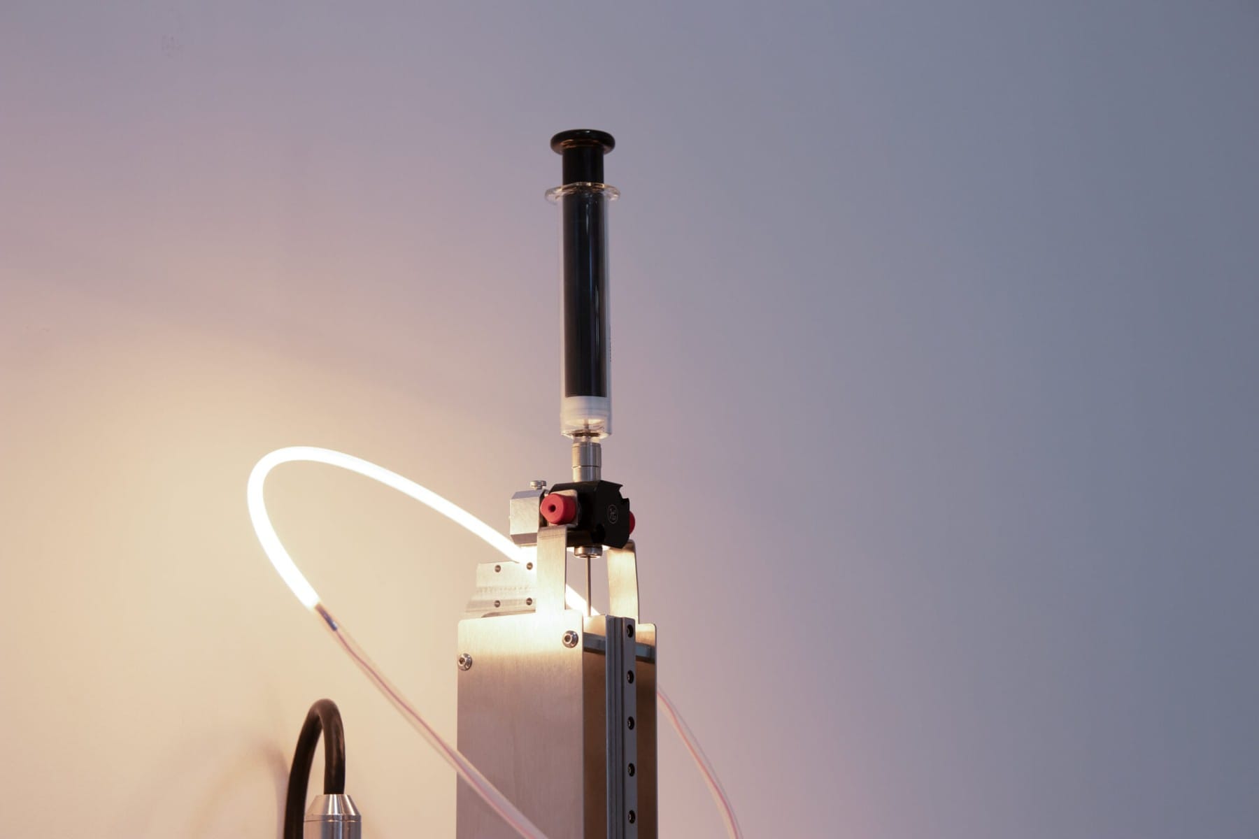 Interaction is central to the work. The syringes act as dimming mechanisms: pressing them modulates light intensity. A calibrated medical gesture becomes a tactile lighting control. Through this translation, light is treated as a measurable and compressible medium, conceptually aligned with fluid handling technologies.