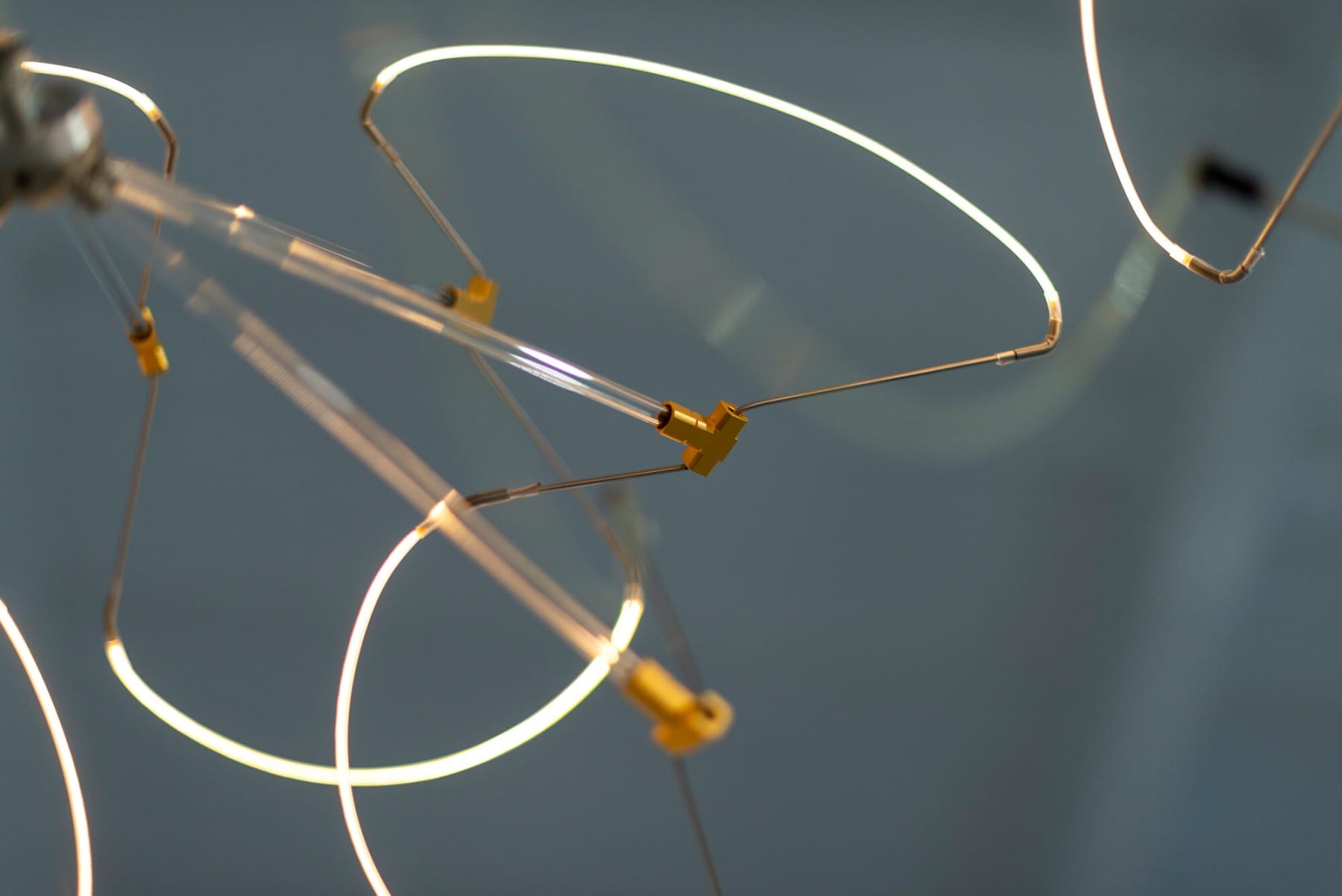 Working within the constraints of a highly regulated industrial environment defined by hygiene protocols, security systems, and advanced manufacturing standards, Blandet sourced discarded syringe components directly from the facility’s waste streams. These high-precision plastic elements—normally engineered for laboratory accuracy—were reassembled into two functional lighting objects.