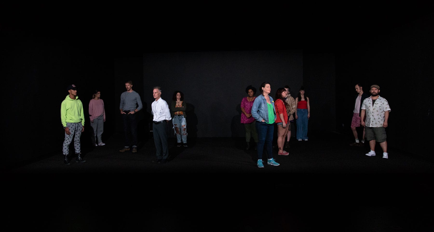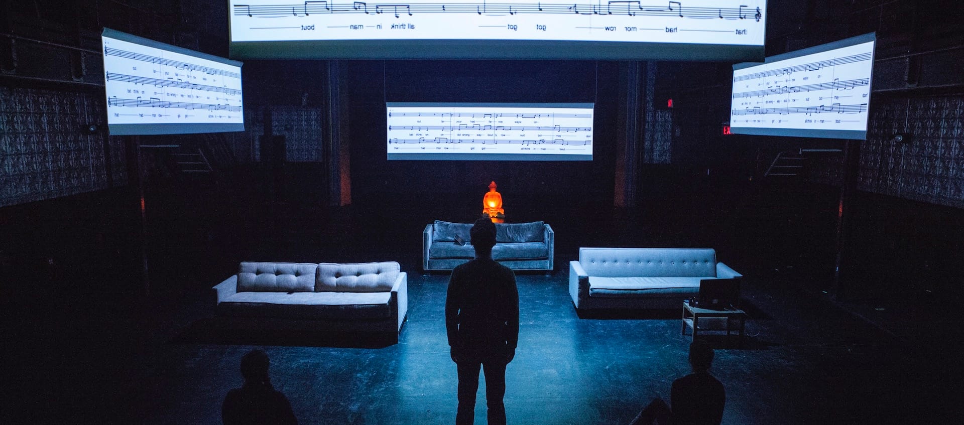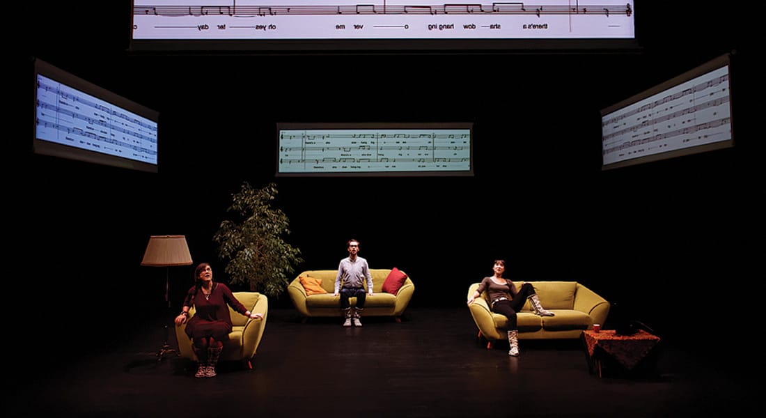 Annie Dorsen’s theater projects foreground computation in real time. In Hello Hi There (2010), a live performance structured around algorithmically recombined philosophical debate, text is generated and delivered on stage through software systems drawing from pre-authored corpora. In The Slow Room (2018), Dorsen employed machine-learning systems trained on canonical dramatic texts to generate dialogue live, shaping each performance through probabilistic output rather than fixed script.