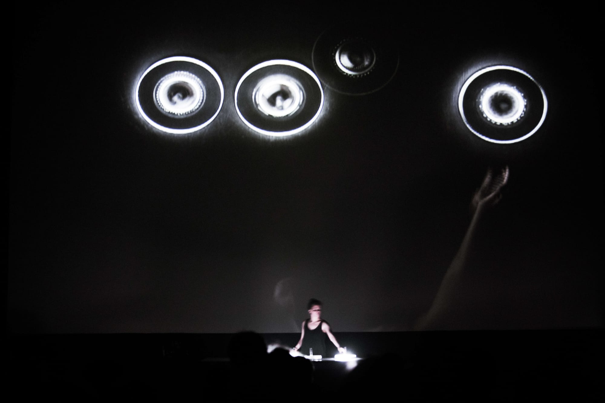 Myriam Bleau’s performance systems make computational response tangible. In Soft Revolvers (2014), she performs with a set of translucent, illuminated discs that function as both instrument and interface. Each object contains embedded sensors that track rotation and gesture, transmitting data to custom software that generates and modulates sound in real time.