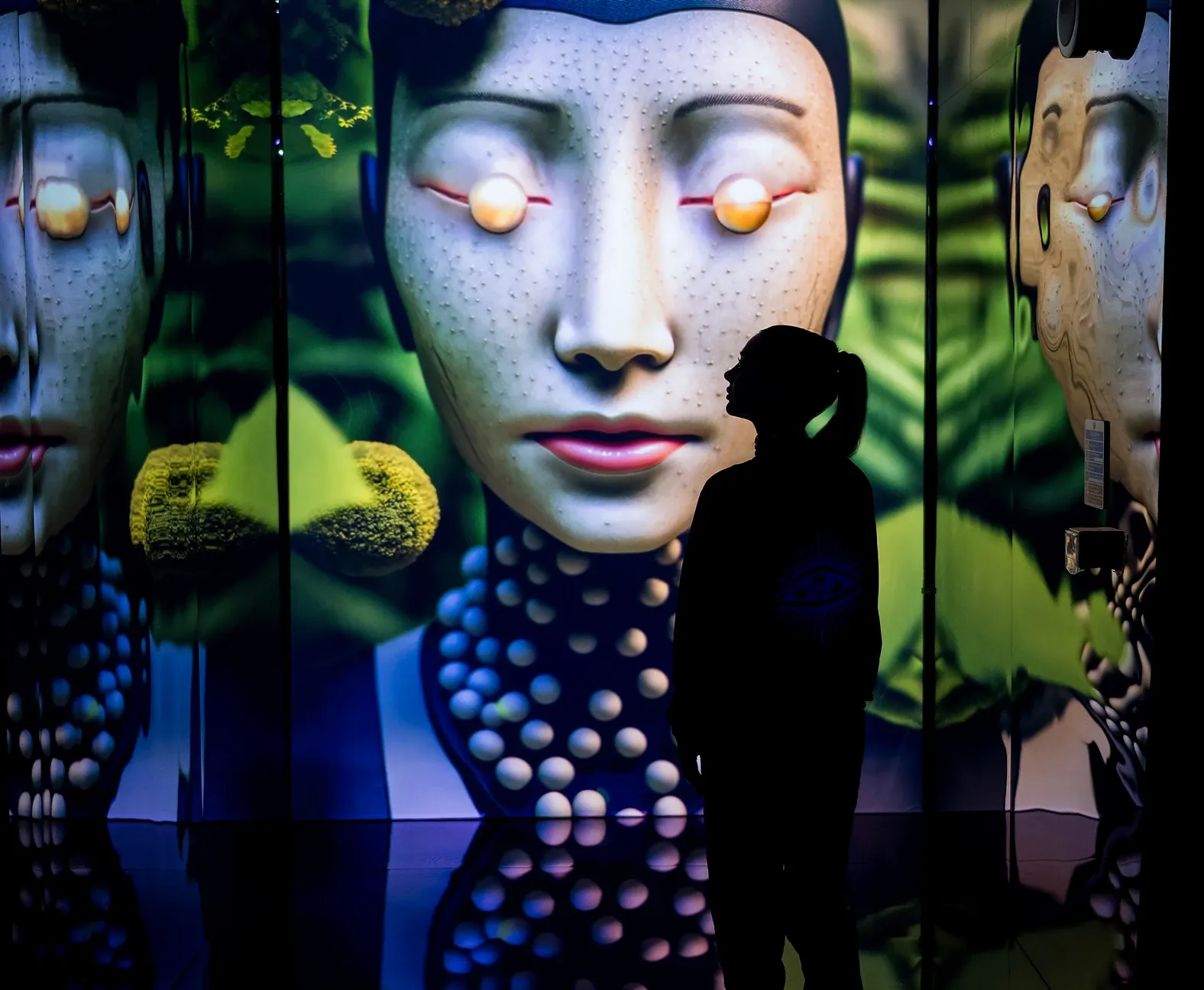 The third room, 'Agents Space,' transports visitors into the future as they encounter utopian beings with faces adorned with wires and microchips, heads immersed in lush greenery, and robotic bodies. The use of computer technology brings these faces to life, blinking and flickering akin to human eyes. The enormous faces displayed across three walls become a symbolic reminder of our potential ignorance about the future.