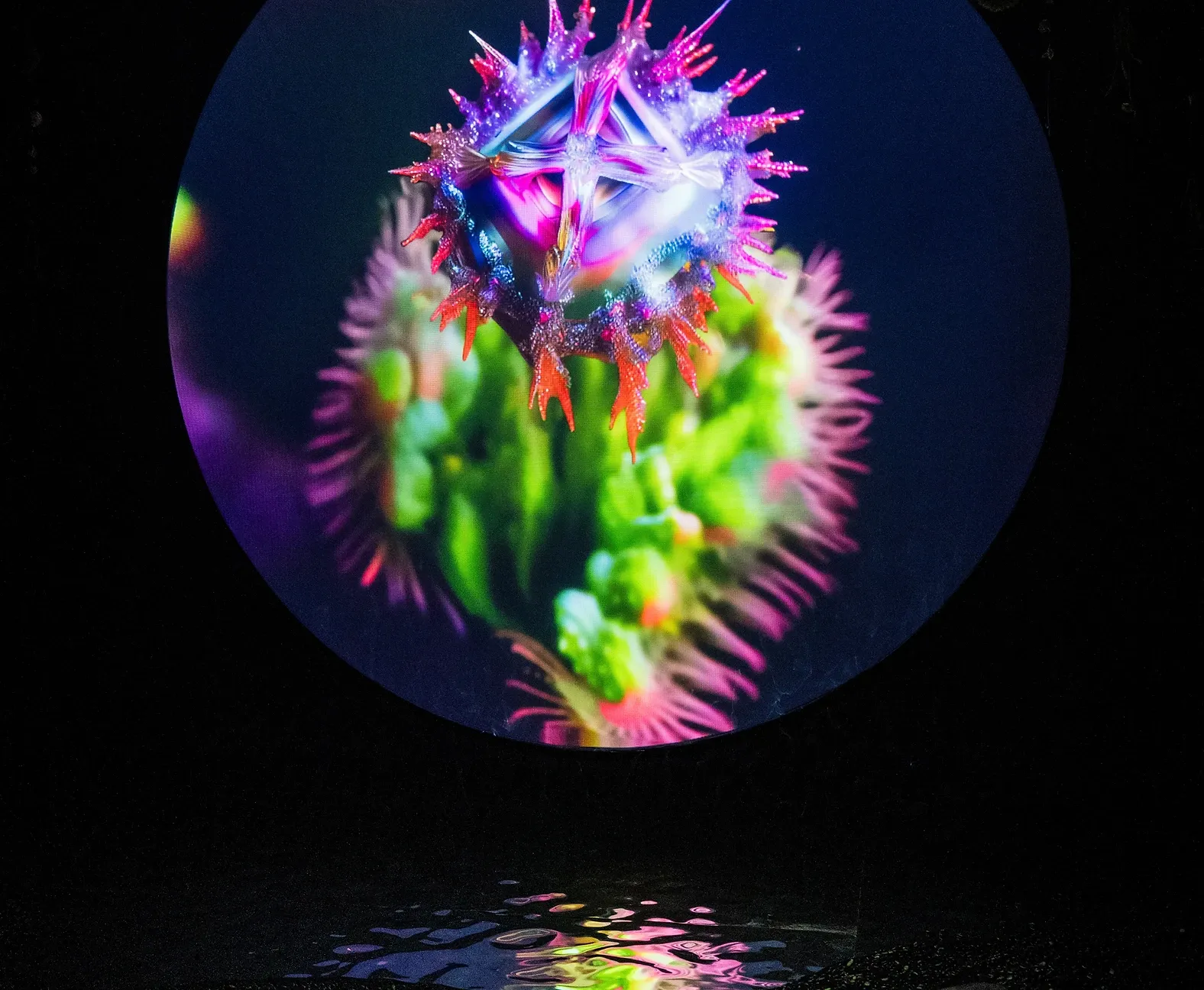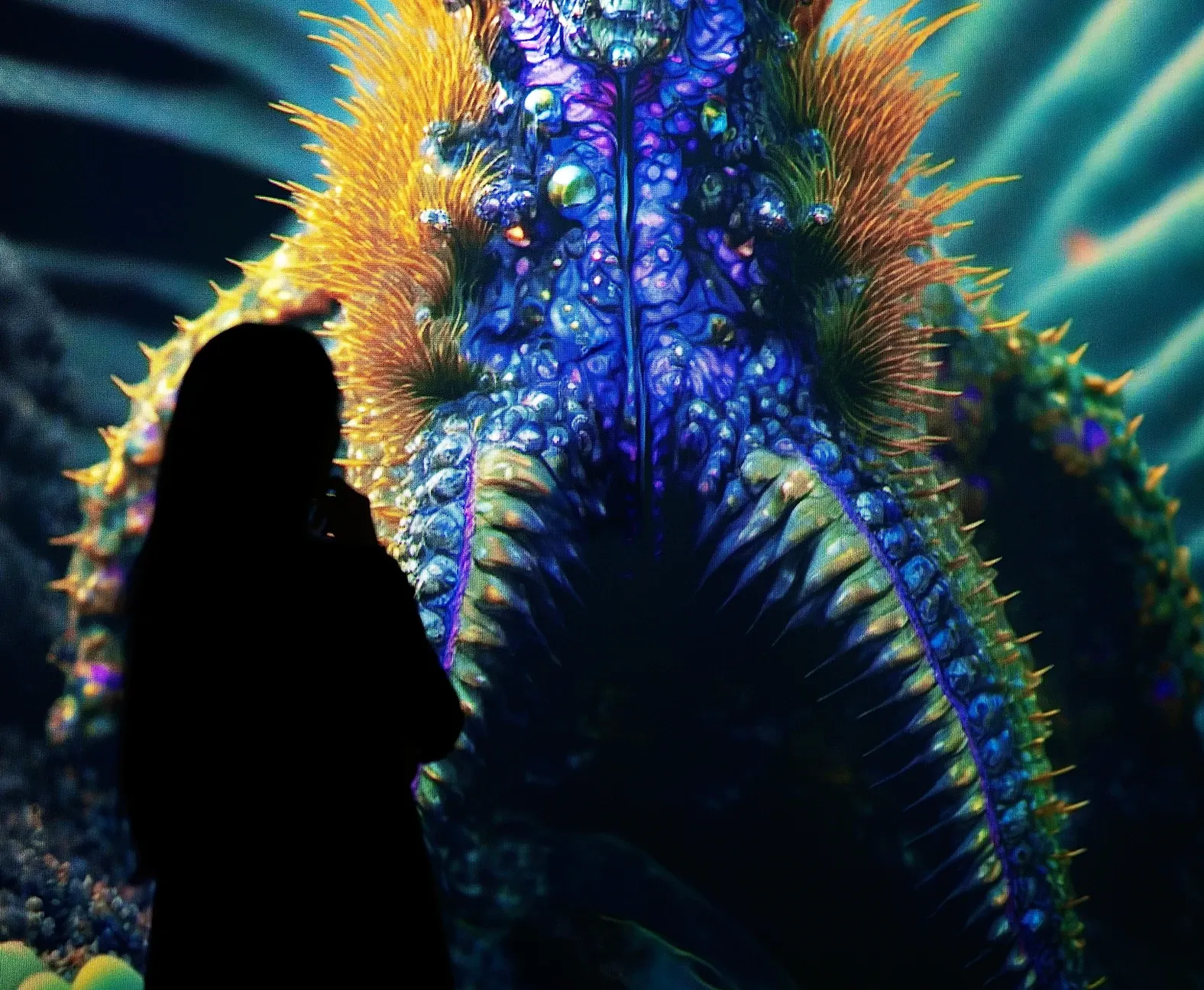 'Complexity Space,' the second room, presents 360° visuals of unprecedented lifeforms and environments. Breathtaking animations surround visitors, drawing them away from reality and encouraging close proximity to the screens for a mesmerizing experience. Kay challenges the audience to contemplate whether sentience is a suitable measure of value and explores how subjectivity may limit our understanding.