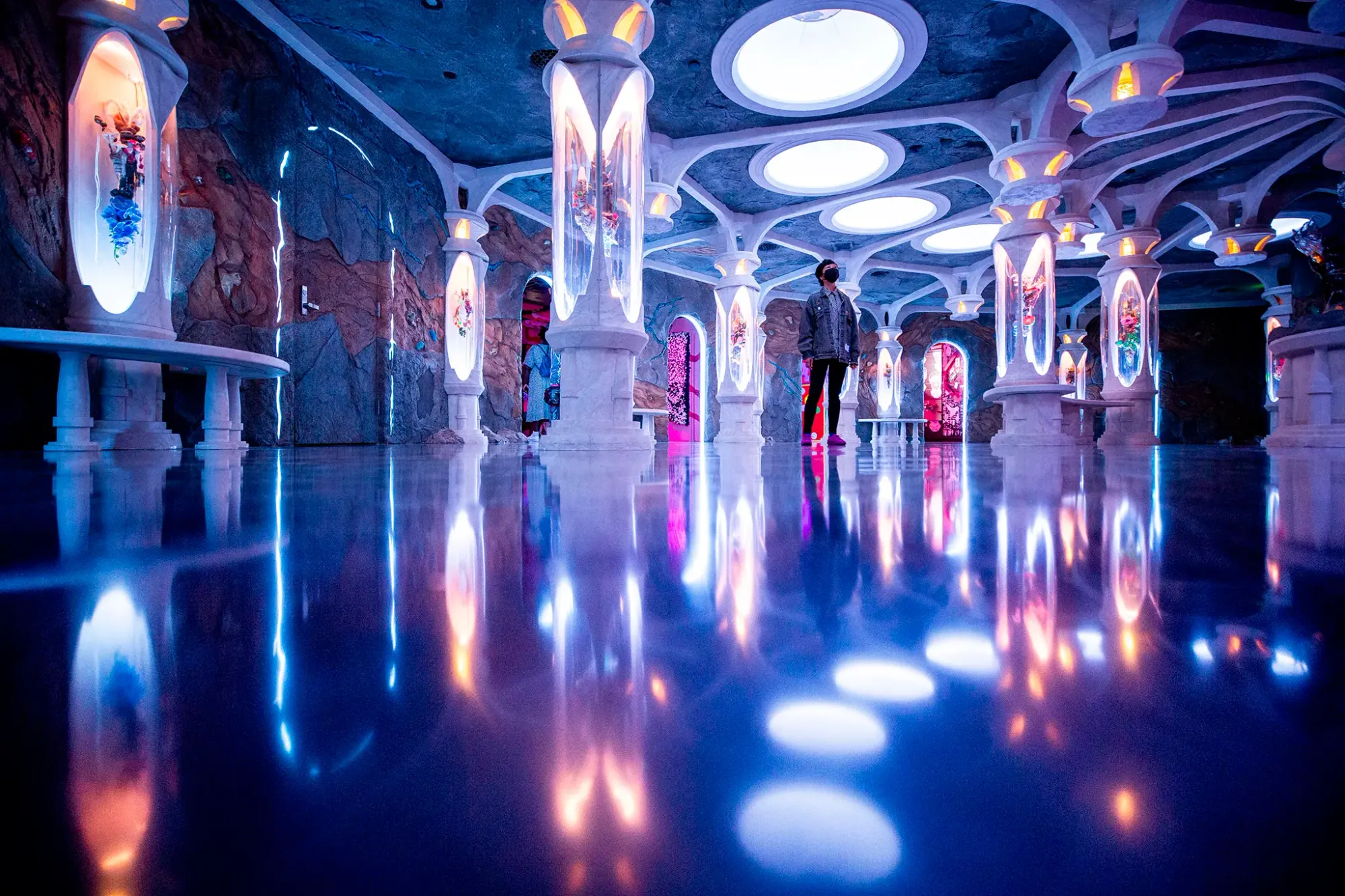 The long view points to computing dissolving into environments. Screens will remain useful but will be only one part of a distributed interface ecology that includes sensors, AI agents, and adaptive spaces. The emphasis shifts from devices to presence: how interaction aligns with natural human movement and communication. For creative practice, this unlocks new possibilities. Installations like Random International’s Rain Room (2012), where human movement alters environmental behavior, hint at how embodied interaction can transform cultural experience. Projects such as TeamLab’s Borderless in Tokyo, where digital projections respond to visitor movement, or Meow Wolf’s Convergence Station in Denver, where immersive installations adapt to presence and touch, further illustrate how design is becoming environmental, adaptive, and multisensory.