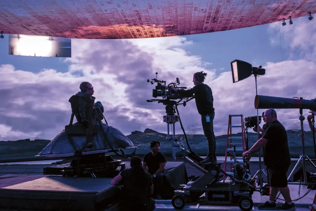Perhaps there is no greater example of this form of filmmaking in the industry than Disney studios and Lucasfilm division ILM (Industrial Light & Magic)’s “The Volume”. The Volume is an immersive LED soundstage. It is 360 degrees of LED panel screens. Backgrounds are built beforehand utilizing a combination of CGI, layered images, and real footage. Sensors are placed on the cameras so the virtual world is oriented with directional integrity. It allows filmmakers to make editing choices in real time and it allows actors to engage with an environment rather than a green screen. The soundstage itself is a combination of the LED screen and physical sets and props.
